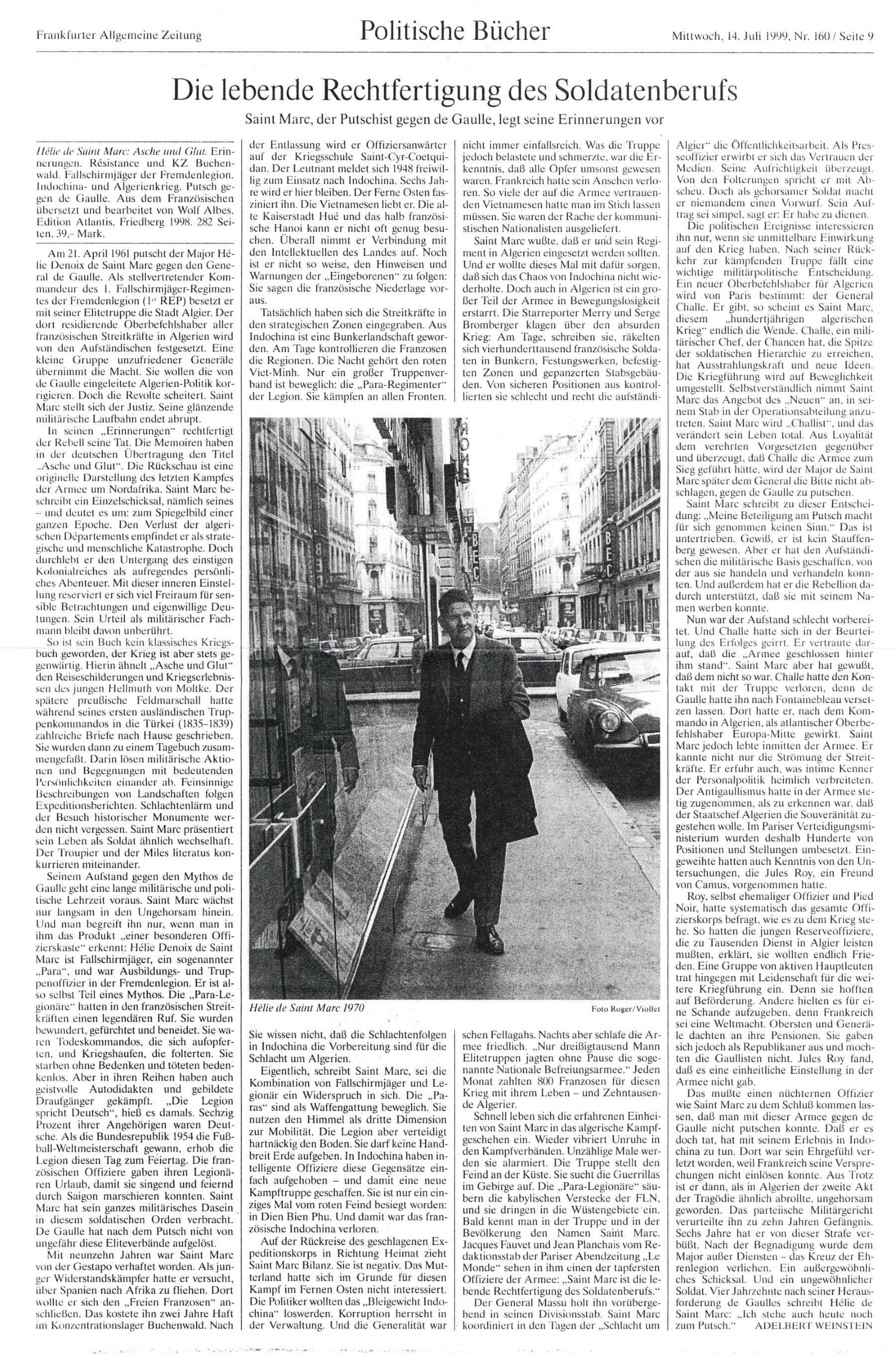 Ruhig, nachdenklich, ohne Pathos und mit kompromissloser Ehrlichkeit skizziert Hélie de Saint Marc die Stationen seines Lebens, in dem sich die Krisen und Umbrüche der französischen Gesellschaft im 20. Jahrhundert widerspiegeln.