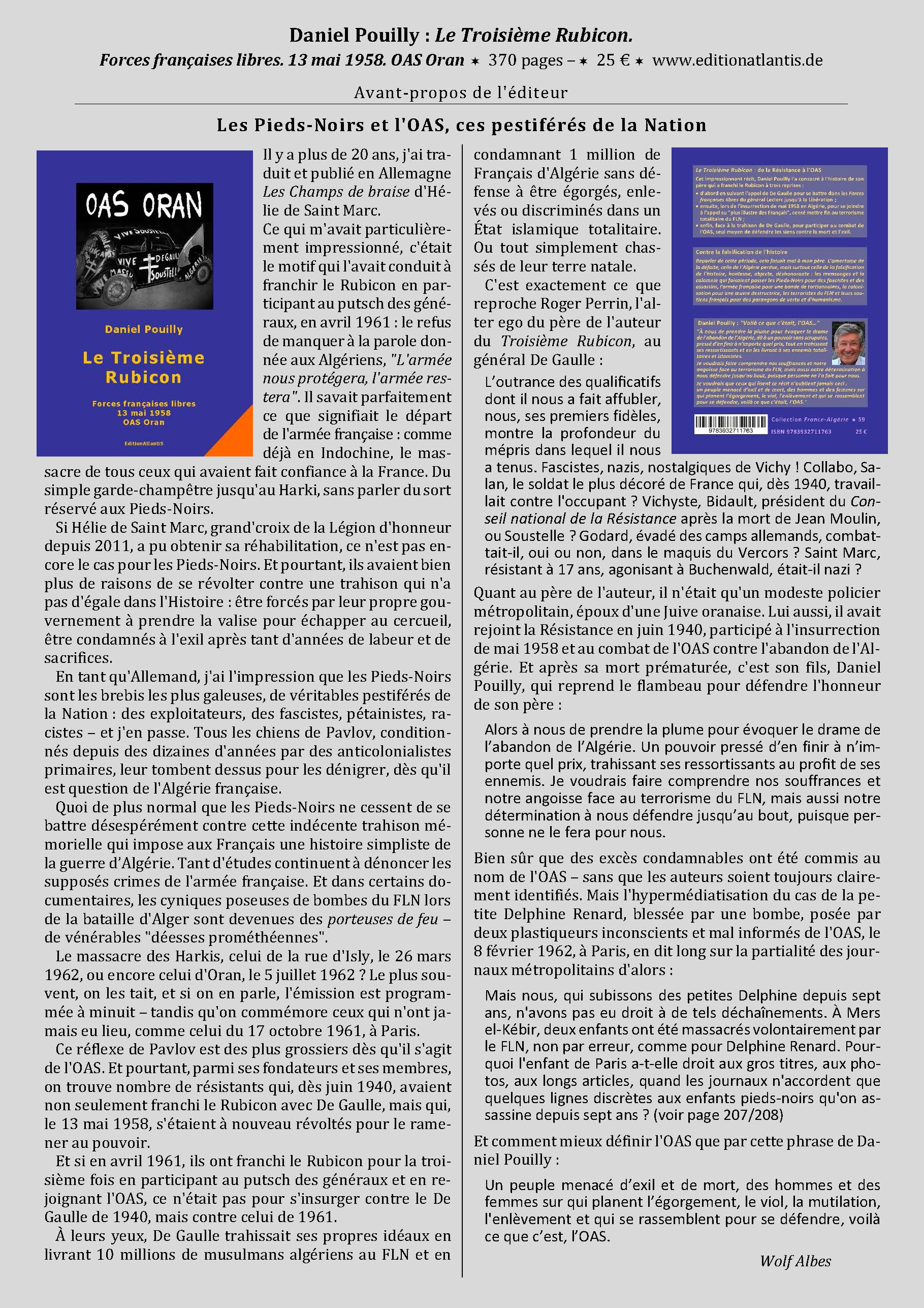 *“À nous de prendre la plume pour évoquer le drame de l’abandon de l’Algérie, dû à un pouvoir sans scrupules, pressé d’en finir à n’importe quel prix, tout en trahissant ses ressortissants et en les livrant à ses ennemis totalitaires et islamistes. *